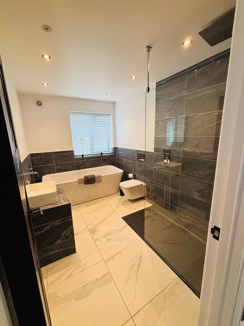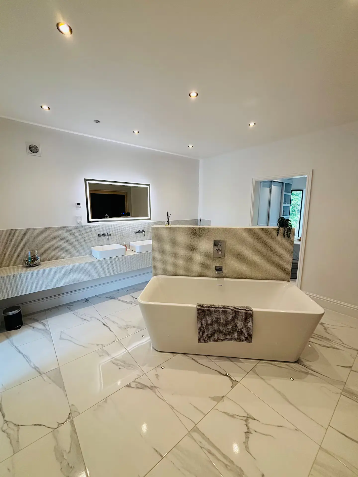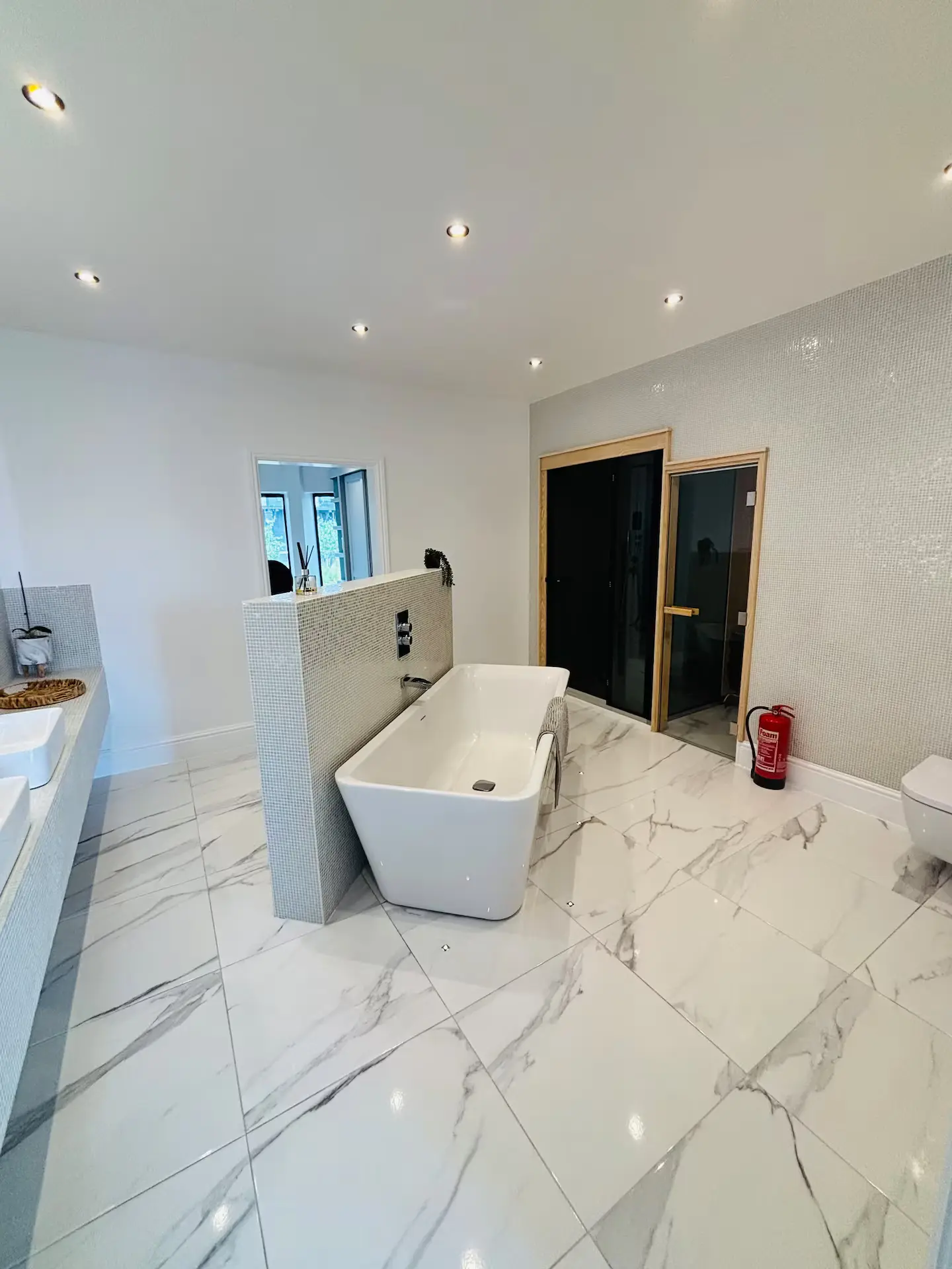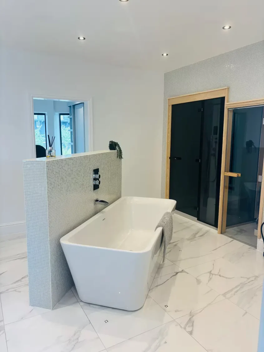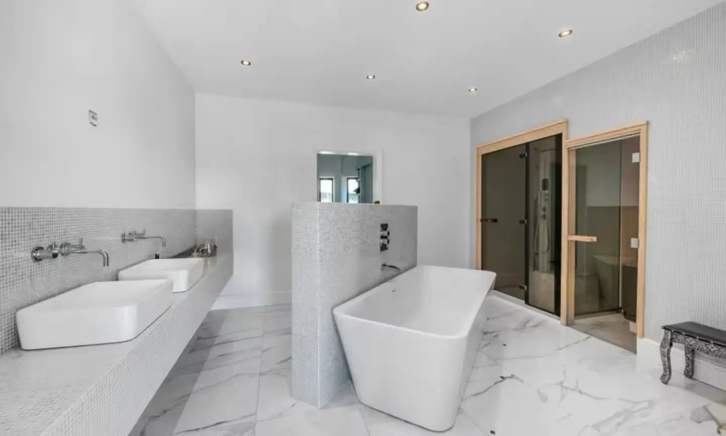 - Freestanding bath + private steam room + sauna