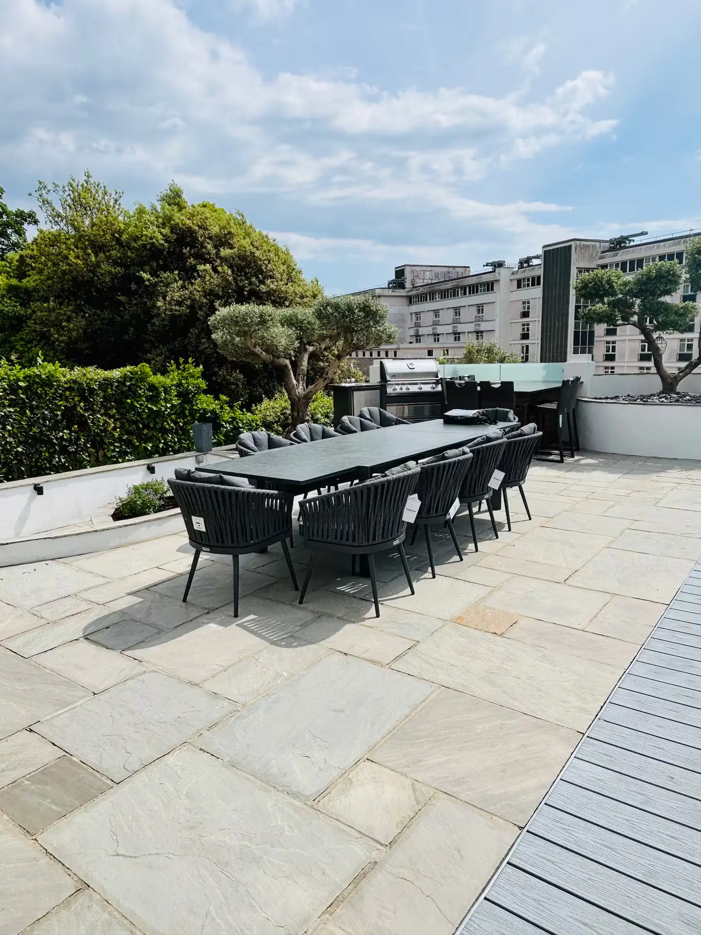 The main living level is built around an open-plan kitchen, dining and lounge area designed for socialising, with large windows and doors that connect directly to the garden. Outside, the south-facing landscaped space has a Mediterranean feel, multiple seating areas, and an outdoor kitchen that makes summer evenings easy.
